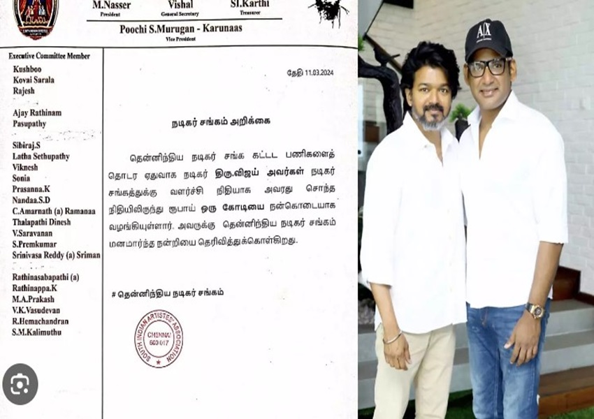 ಕಲಾಸಂಘದ ವತಿಯಿಂದ ಕಟ್ಟಲಾಗುತ್ತಿರುವ ಕಟ್ಟಡಕ್ಕೆ ವಿಜಯ್, 1 ಕೋಟಿ ರೂಪಾಯಿ ದೇಣಿಗೆ ಕೊಟ್ಟಿದ್ದಾರೆ. ಈ ಸಂಘದ ಅಧ್ಯಕ್ಷರಾಗಿರುವ ನಿರ್ಮಾಪಕ, ನಟ ವಿಶಾಲ್, ವಿಜಯ್ ಅವರ ಸಹಾಾಯಕ್ಕೆ ಧನ್ಯವಾಾದ ಹೇಳಿದ್ದಾರೆ. ಥ್ಯಾಂಕ್ಯೂ ಎನ್ನುವುದು ಸಣ್ಣ ಶಬ್ದವಾಗುತ್ತದೆ. ಆದರೆ ಸಹೃದಯದಿಂದ ಸಹಾಯ ಮಾಡಿದವರಿಗೆ ಇದು ಬಹುದೊಡ್ಡ ಪದ. ವಿಜಯ್ ಅವರ ಸಹಾಯವಿಲ್ಲದೇ, ನಮ್ಮ ಕೆಲಸ ಮುಂದುವರೆಯುವುದಿಲ್ಲವೆಂದು ನಮಗೆ ಗೊತ್ತಿತ್ತು. ವಿಜಯ್ ಅವರು ನಮಗೆ ದೇಣಿಗೆ ನೀಡಿ, ನಮ್ಮ ಕೆಲಸಕ್ಕೆ ಇಂಧನ ತುಂಬುವ ಕೆಲಸ ಮಾಡಿದ್ದಾರೆಂದು ಬರೆದುಕೊಂಡಿದ್ದಾರೆ.
