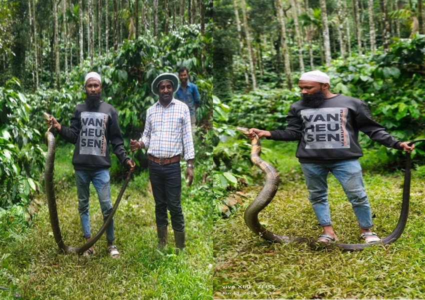 ಗ್ರಾಮದ ಚಿಮ್ಮಿಕೋಲು ಕಾಫಿ ಎಸ್ಟೇಟಿನಲ್ಲಿ ಕಾಫಿ ಗಿಡದಲ್ಲಿ ಕಾಳಿಂಗ ಸರ್ಪ ಅಡಗಿ ಕುಳಿತಿದ್ದು, ಸುಮಾರು 12 ಅಡಿ ಉದ್ದದ ಕಾಳಿಂಗ ಸರ್ಪವನ್ನು ಸೆರೆ ಹಿಡಿಯಲಾಗಿದೆ. ಬಳಿಕ ಸುರಕ್ಷಿತವಾಗಿ ಅರಣ್ಯ ಪ್ರದೇಶಕ್ಕೆ ಬಿಡಲಾಗಿದೆ.
