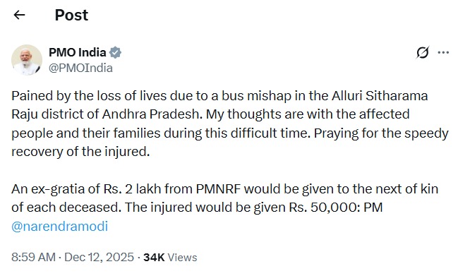 ಈ ದುರಂತದ ಕುರಿತು ಪ್ರಧಾನಿ ನರೇಂದ್ರ ಮೋದಿ ಆಳವಾದ ಸಂತಾಪ ವ್ಯಕ್ತಪಡಿಸಿದ್ದಾರೆ. “ಅಲ್ಲೂರಿಯಲ್ಲಿ ಸಂಭವಿಸಿದ ಅಪಘಾತ ಬಹಳ ನೋವುಂಟು ಮಾಡಿದೆ. ಈ ಸಂಕಷ್ಟದಲ್ಲಿ ಸಂತ್ರಸ್ತ ಕುಟುಂಬಗಳೊಂದಿಗೆ ನನ್ನ ಆಲೋಚನೆಗಳಿವೆ. ಗಾಯಾಳುಗಳು ಶೀಘ್ರ ಚೇತರಿಸಿಕೊಳ್ಳಲಿ” ಎಂದು ಸಾಮಾಜಿಕ ಮಾಧ್ಯಮದಲ್ಲಿ ಬರೆದಿದ್ದಾರೆ.