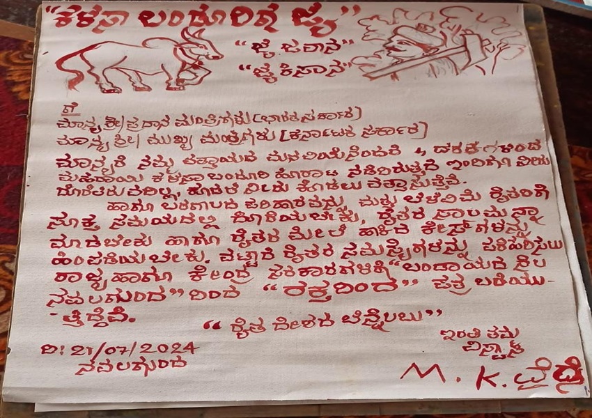 ಯುವರೈತ ಮೈಲಾರಪ್ಪ ವೈದ್ಯ ಎಂಬ ರೈತ ಹುತಾತ್ಮ ದಿನಾಚರಣೆ ವೇದಿಕೆಯಲ್ಲಿ ರಕ್ತದಲ್ಲಿ ಪತ್ರ ಬರೆದಿದ್ದಾರೆ. ಇನ್ನು ಇವರು ಇದೇ ಮೊದಲು ರಕ್ತದಲ್ಲಿ ಪತ್ರ ಬರೆದವರಲ್ಲ, ಬದಲಾಗಿ ಕಳೆದ ಮೂರು ವರ್ಷಗಳಿಂದ ರಕ್ತದಲ್ಲಿ ಪತ್ರ ಬರೆಯುತ್ತಿದ್ದಾರೆ. ಮಹಾದಾಯಿ ಬೇಡಿಕೆ ಈಡೇರಿಸುವಂತೆ ಇವರು ಕೇಂದ್ರ ಮತ್ತು ರಾಜ್ಯ ಸರ್ಕಾರಕ್ಕೆ ಪತ್ರ ಬರೆಯುತ್ತಿದ್ದಾರೆ.