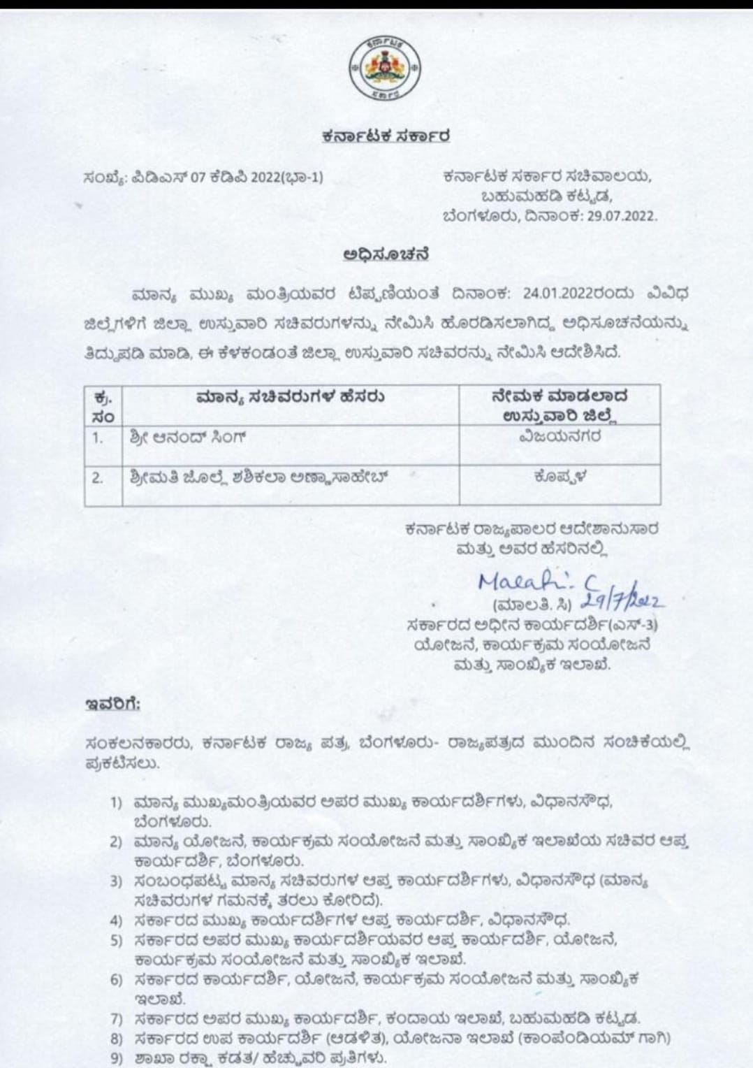 ಈ ಸಂಬಂಧ ರಾಜ್ಯ ಸರ್ಕಾರದ ಅಧೀನ ಕಾರ್ಯದರ್ಶಿ ಅಧಿಸೂಚನೆ ಹೊರಡಿಸಿದ್ದು, ವಿಜಯನಗರ ಜಿಲ್ಲೆಯ ಜಿಲ್ಲಾ ಉಸ್ತುವಾರಿ ಸಚಿವರನ್ನಾಗಿ ಆನಂದ್ ಸಿಂಗ್, ಕೊಪ್ಪಳ ಜಿಲ್ಲೆಯ ಜಿಲ್ಲಾ ಉಸ್ತುವಾರಿ ಸಚಿವೆಯಾಗಿ ಶಶಿಕಲಾ ಜೊಲ್ಲೆಯವರನ್ನು ನೇಮಿಸಿ ಆದೇಶಿಸಿದ್ದಾರೆ.