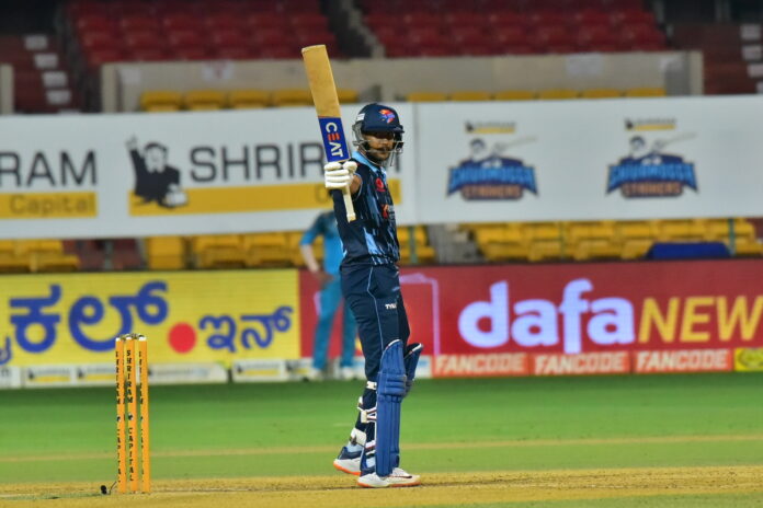 ಬೆಂಗಳೂರು ಬ್ಲಾಸ್ಟರ್ಸ್: 20 ಓವರ್ಗಳಲ್ಲಿ 3 ವಿಕೆಟ್ 227 (ಮಯಾಂಕ್ ಅಗರ್ವಾಲ್ 112*, ಎಲ್.ಆರ್. ಚೇತನ್ 88, ಅನಿರುಧ್ ಜೋಶೀ 20,ವಿದ್ವತ್ ಕಾವೇರಪ್ಪ 48ಕ್ಕೆ 2)