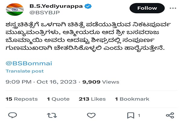 ಈ ಕುರಿತು ಸಾಮಾಜಿಕ ಜಾಲತಾಣ ಎಕ್ಸ್ನಲ್ಲಿ ಬರೆದುಕೊಂಡಿರುವ ಮಾಜಿ ಸಿಎಂ ಬಿ.ಎಸ್. ಯಡಿಯೂರಪ್ಪ, ಶಸ್ತ್ರಚಿಕಿತ್ಸೆಗೆ ಒಳಗಾಗಿ ಚಿಕಿತ್ಸೆ ಪಡೆಯುತ್ತಿರುವ ನಿಕಟಪೂರ್ವ ಮುಖ್ಯಮಂತ್ರಿಗಳು, ಆತ್ಮೀಯರೂ ಆದ ಶ್ರೀ ಬಸವರಾಜ ಬೊಮ್ಮಾಯಿ ಅವರು ಆದಷ್ಟು ಶೀಘ್ರದಲ್ಲಿ ಸಂಪೂರ್ಣ ಗುಣಮುಖರಾಗಿ ಚೇತರಿಸಿಕೊಳ್ಳಲಿ ಎಂದು ಹಾರೈಸಿದ್ದಾರೆ.
