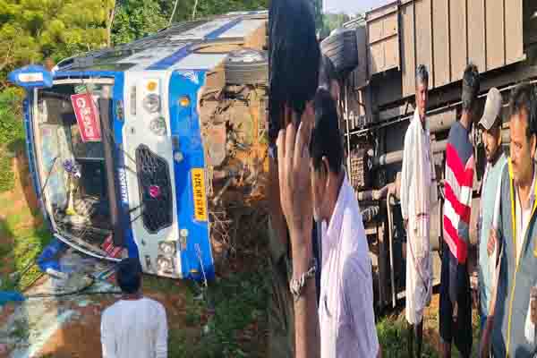 ಚಳ್ಳಕೆರೆ ತಾಲೂಕಿನ ನಾಯಕನಹಟ್ಟಿ ಸಮೀಪದ ಗರಣಿ ಕ್ರಾಸ್ ಕಡೆಗೆ ಹೋಗುತ್ತಿದ್ದ ಖಾಸಗಿ ಬಸ್ ಎದುರುಗಡೆಯಿಂದ ಬಂದ ಬೈಕ್ ಗೆ ಡಿಕ್ಕಿ ಹೊಡೆಯುವುದನ್ನು ತಪ್ಪಿಸಲು ಹೋಗಿ ನಿಯಂತ್ರಣ ತಪ್ಪಿ ಪಲ್ಟಿಯಾಗಿದೆ.