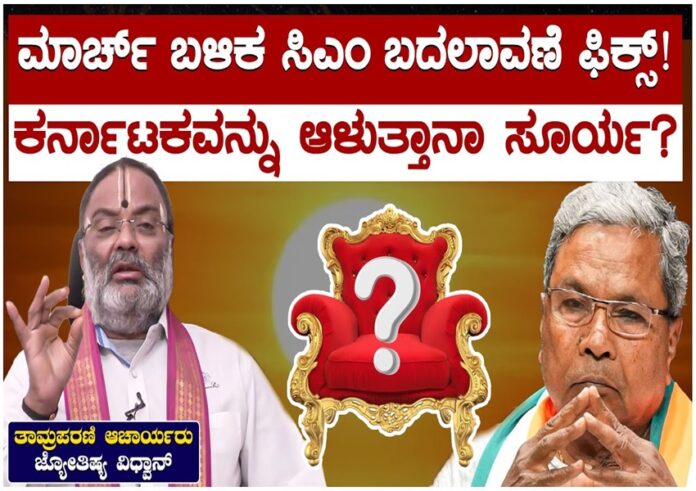 ಇನ್ನು ಕರ್ನಾಟಕದ ಭವಿಷ್ಯ ಹೇಳುವುದಾದರೆ, ಕರ್ನಾಟಕವನ್ನು ಆಳುವ ಗ್ರಹ ಅಂದ್ರೆ ಸೂರ್ಯ. ಸೂರ್ಯ ಮತ್ತು ಮಂಗಳ ರಾಜ ಮತ್ತು ಮಂತ್ರಿ ಗ್ರಹ. ಹೀಗಾಗಿ ರಾಜ್ಯದಲ್ಲಿ ಕೆಲವು ಕೆಲಸಗಳು ಕೊನೆಯ ಹಂತಕ್ಕೆ ಬಂದು ನಿಲ್ಲುವ ಸಾಧ್ಯತೆ ಇರುತ್ತದೆ. ಮಾರ್ಚ್ ಬಳಿಕ ಸಿಎಂ ಬದಲಾವಣೆಯಾಗುವ ಎಲ್ಲ ಸಾಧ್ಯತೆಗಳಿದೆ ಎಂದು ಭವಿಷ್ಯ ನುಡಿದಿದ್ದಾರೆ ತಾಮ್ರಪರ್ಣಿ ಗುರೂಜಿ.