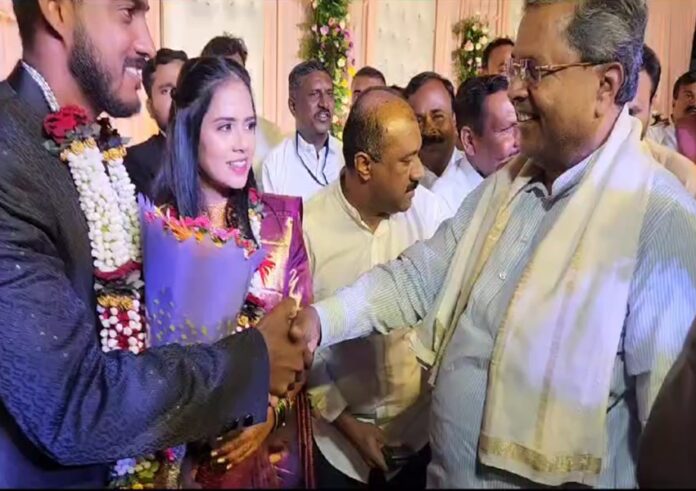 ಹುಬ್ಬಳ್ಳಿಯ ಖಾಸಗಿ ಹೋಟೆಲ್ ನಲ್ಲಿ ಅಯೋಜಿಸಲಾಗಿದ್ದ ಆರತಕ್ಷತೆಗೆ ಆಗಮಿಸಿದ ಸಿಎಂ ಸಿದ್ಧರಾಮಯ್ಯ ಹಾಗೂ ಸಚಿವ ಸಂತೋಷ ಲಾಡ್ ವಧುವರರಿಗೆ ಶುಭಕೋರಿದರು.