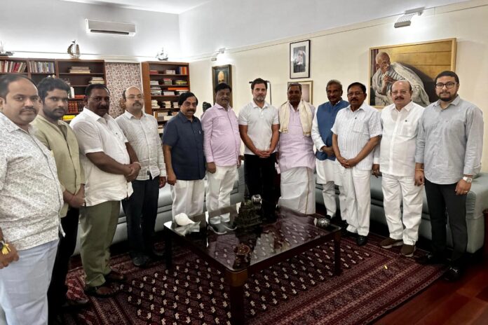 ನವದೆಹಲಿ: ಮುಖ್ಯಮಂತ್ರಿ ಸಿದ್ದರಾಮಯ್ಯ ಅವರು ಲೋಕಸಭೆ ವಿರೋಧ ಪಕ್ಷದ ನಾಯಕರಾಗಿ ಆಯ್ಕೆಯಾದ ರಾಹುಲ್ ಗಾಂಧಿಯವರನ್ನು ದೆಹಲಿಯ ನಿವಾಸದಲ್ಲಿ ಭೇಟಿ ಮಾಡಿದರು. ಭೇಟಿ ಮಾಡಿ ಅಭಿನಂದನೆ ಸಲ್ಲಿಸಿದರು.