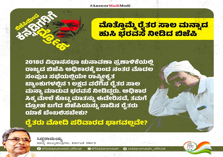 ಕಳೆದ ಚುನಾವಣೆಯಲ್ಲಿ ಕೂಡ ಬಿಜೆಪಿ ತಾನು ಅಧಿಕಾರಕ್ಕೆ ಬಂದರೆ ಮೊದಲ‌ ಸಂಪುಟ ಸಭೆಯಲ್ಲೇ ರಾಷ್ಟ್ರೀಕೃತ ಬ್ಯಾಂಕುಗಳಲ್ಲಿರುವ ರೂ. 1 ಲಕ್ಷದ ವರೆಗಿನ ರೈತರ ಸಾಲ ಮನ್ನಾ ಮಾಡುವ ಭರವಸೆ ನೀಡಿ, ಅಧಿಕಾರ ಸಿಕ್ಕ ನಂತರ ಕೊಟ್ಟ ಮಾತಿನಂತೆ ನಡೆಯಲೇ ಇಲ್ಲ. ಇದು ರೈತರಿಗೆ ಮಾಡಿದ ದ್ರೋಹ ಅಲ್ಲವೇ ನರೇಂದ್ರಮೋದಿ ಅವರೇ?