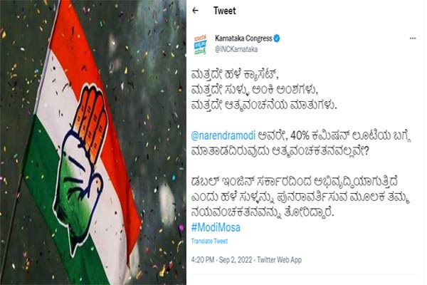 ನರೇಂದ್ರ ಮೋದಿ ಶೇ. 40 ಕಮಿಷನ್ ಲೂಟಿ ಬಗ್ಗೆ ಮಾತನಾಡದಿರುವುದು ಆತ್ಮ ವಂಚಕತನವಲ್ಲವೇ ಎಂದು ಟ್ವೀಟ್ ಮಾಡಿರುವ ಕರ್ನಾಟಕ ಕಾಂಗ್ರೆಸ್, ಈ ರೀತಿಯಾಗಿ ಪ್ರಶ್ನಿಸಿದೆ.