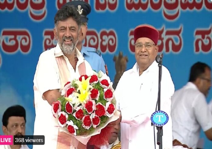 ರಾಜ್ಯ ರಾಜ್ಯಪಾಲರಾದ ಥಾವರ್ ಸಿಂಗ್ ಗೆಹ್ಲೋಟ್ ಡಿ.ಕೆ.ಶಿವಕುಮಾರ್ ಗೆ ಪ್ರಮಾಣವಚನ ಬೋಧಿಸಿದ್ದು, ಡಿ.ಕೆ.ಶಿವಕುಮಾರ್ ಹೆಸರಿನ ನಾನು ಎಂದು ಮಾತು ಆರಂಭಿಸಿದ ಡಿಕೆಶಿ, ಶ್ರೀಗಂಗಾಧನ ಅಜ್ಜನ ಹೆಸರಿನಲ್ಲಿ ಪ್ರಮಾಣವಚನ ಸ್ವೀಕರಿಸಿದ್ದಾರೆ.