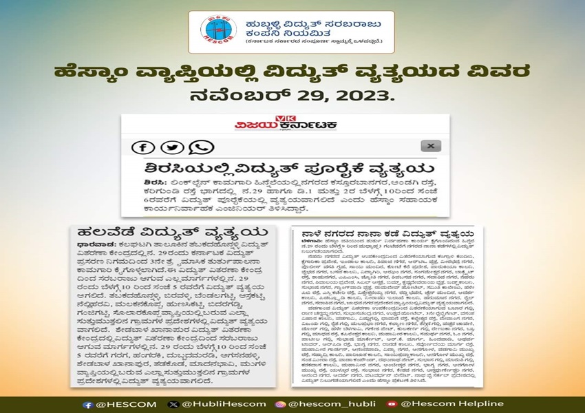 ಈ ವಿದ್ಯುತ್ ವಿತರಣಾ ಕೇಂದ್ರದಿಂದ ಸರಬರಾಜು ಆಗುವ ಎಲ್ಲಾ 11ಕೆವಿ ಮಾರ್ಗಗಳಲ್ಲಿ ನವೆಂಬರ್ 29 ರಂದು ಬೆಳಿಗ್ಗೆ 10 ಗಂಟೆಯಿಂದ ಸಂಜೆ 5 ಗಂಟೆಯವರೆಗೆ ಗರಗ, ಹಂಗರಕಿ, ದುಬ್ಬದಮರಡಿ, ಅಗಸನಹಳ್ಳಿ, ಶೇಡಬಾಳ ಖಾನಾಪುರ, ತಡಕೊಡ, ಮಾದನಭಾವಿ, ಮುಗಳಿ, ಹೋಸಟ್ಟಿ, ಬೋಗೂರು, ಜಿರಗಿವಾಡ ಮತ್ತು ಕೊಟಬಾಗಿ ವ್ಯಾಪ್ತಿಯಲ್ಲಿ ಬರುವ ಎಲ್ಲಾ ಸುತ್ತುಮುತ್ತಲಿನ ಗ್ರಾಮಗಳ ಪ್ರದೇಶಗಳಲ್ಲಿ ವಿದ್ಯುತ್ ವ್ಯತ್ಯಯವಾಗಲಿದೆ ಎಂದು ಹೆಸ್ಕಾಂ ಪ್ರಕಟಣೆ ತಿಳಿಸಿದೆ.