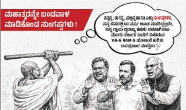 ರಾಜ್ಯ ರಾಜಕಾರಣದಲ್ಲಿ ಹೊಸ ಜಾಹೀರಾತು ವಿವಾದ ಸೃಷ್ಟಿಸಿದೆ. ವಿಬಿ ಜಿರಾಮ್ಜಿ ವಿಷಯಕ್ಕೆ ತಿರುಗೇಟು ನೀಡಲು ಮುಂದಾದ ಬಿಜೆಪಿ ತನ್ನ ಹೊಸ ಜಾಹೀರಾತಿನಲ್ಲಿ ಮಹಾತ್ಮ ಗಾಂಧೀಜಿಯನ್ನು ಕಾಂಗ್ರೆಸ್ ನಾಯಕರಿಗೆ ದೊಣ್ಣೆಯಿಂದ ಹೊಡೆಯುತ್ತಿರುವಂತೆ ಚಿತ್ರಿಸಿದೆ. ಈ ಜಾಹೀರಾತು ರಾಜ್ಯ ರಾಜಕೀಯದಲ್ಲಿ ತೀವ್ರ ಚರ್ಚೆ ಹುಟ್ಟಿಸಿದೆ.