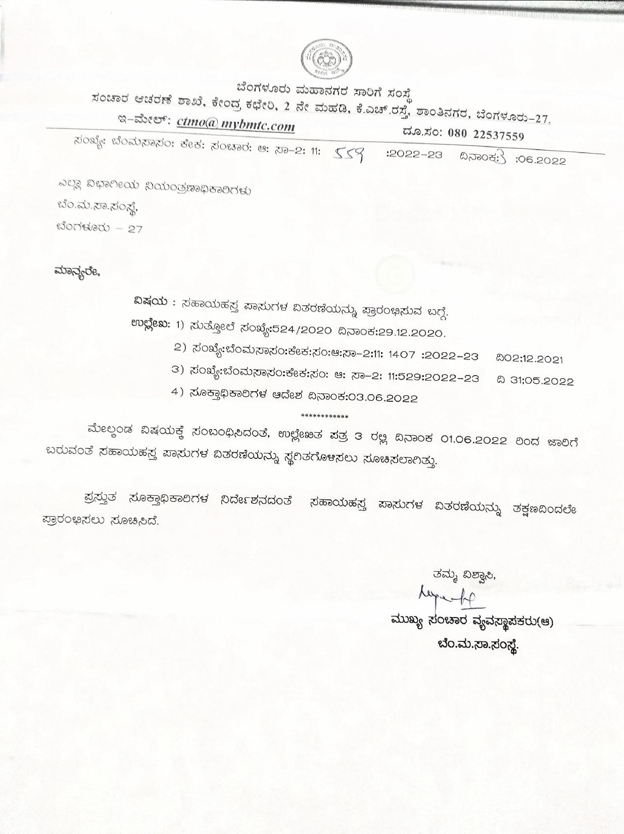 ಬಿಎಂಟಿಸಿಯ ಮುಖ್ಯ ಸಂಚಾರ ವ್ಯವಸ್ಥಾಪಕರು ಈ ಕುರಿತಂತೆ ಆದೇಶ ಹೊರಡಿಸಿದ್ದಾರೆ. ದಿನಾಂಕ 01-06-2022ರಿಂದ ಜಾರಿಗೆ ಬರುವಂತೆ ಕಟ್ಟಡ ಕಾರ್ಮಿಕರಿಗೆ ವಿತರಿಸಲಾಗುತ್ತಿದ್ದಂತ ಬಿಎಂಟಿಸಿಯ ಸಹಾಯ ಹಸ್ತದ ಪಾಸ್ ವಿತರಣೆಯನ್ನು ಸ್ಥಗಿತಗೊಳಿಸಲಾಗಿತ್ತು. ಆದ್ರೇ.. ಸೂಕ್ತ ಅಧಿಕಾರಿಗಳ ನಿರ್ದೇಶನದಂತೆ ಮತ್ತೆ ಸಹಾಯ ಹಸ್ತದ ಬಸ್ ಪಾಸ್ ಗಳನ್ನು ತಕ್ಷಣದಿಂದ ಪ್ರಾರಂಭಿಸುವಂತೆ ಸೂಚಿಸಿದ್ದಾರೆ.