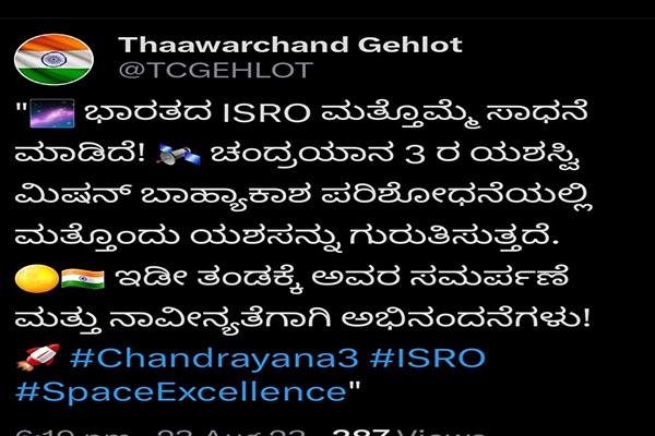 ಬೆಂಗಳೂರು : ಭಾರತೀಯ ಬಾಹ್ಯಾಕಾಶ ಸಂಶೋಧನಾ ಸಂಸ್ಥೆ (ಇಸ್ರೋ) ವಿಜ್ಞಾನಿಗಳು ಚಂದ್ರಯಾನ-3 ನೌಕೆಯನ್ನು ಚಂದ್ರನ ಅಂಗಳದಲ್ಲಿ ಇಳಿಸುವ ಮೂಲಕ ಯಶಸ್ವಿಯಾಗಿದ್ದು, ಇಸ್ರೋ ತಂಡಕ್ಕೆ ಕರ್ನಾಟಕದ ಗೌರವಾನ್ವಿತ ರಾಜ್ಯಪಾಲರಾದ ಶ್ರೀ ಥಾವರ್ ಚಂದ್ ಗೆಹ್ಲೋಟ್ ಅಭಿನಂದಿಸಿದ್ದಾರೆ.