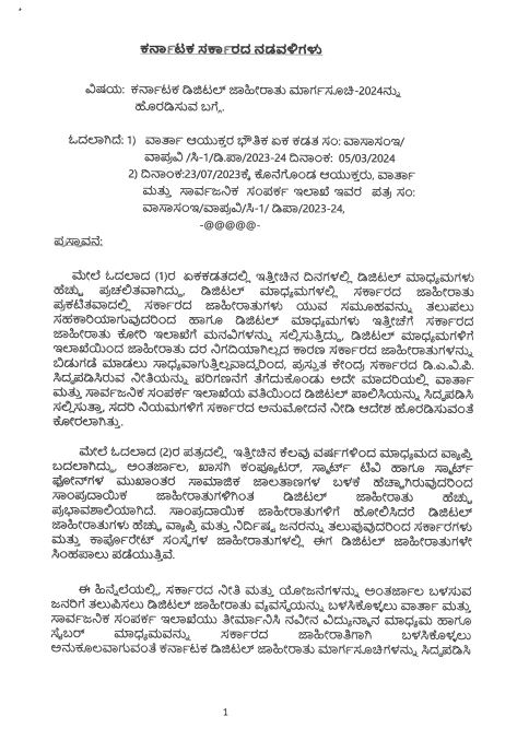 ಈ ಹಿನ್ನೆಲೆಯಲ್ಲಿ, ಸರ್ಕಾರದ ನೀತಿ ಮತ್ತು ಯೋಜನೆಗಳನ್ನು ಅಂತರ್ಜಾಲ ಬಳಸುವ ಜನರಿಗೆ ತಲುಪಿಸಲು ಡಿಜಿಟಲ್ ಜಾಹೀರಾತು ವ್ಯವಸ್ಥೆಯನ್ನು ಬಳಸಿಕೊಳ್ಳಲು ವಾರ್ತಾ ಮತ್ತು ಸಾರ್ವಜನಿಕ ಸಂಪರ್ಕ ಇಲಾಖೆಯು ತೀರ್ಮಾನಿಸಿ ನವೀನ ವಿದ್ಯುನ್ಮಾನ ಮಾಧ್ಯಮ ಹಾಗೂ ಸೈಬರ್ ಮಾಧ್ಯಮವನ್ನು ಸರ್ಕಾರದ ಜಾಹೀರಾತಿಗಾಗಿ ಬಳಸಿಕೊಳ್ಳಲು ಅನುಕೂಲವಾಗುವಂತೆ ಕರ್ನಾಟಕ ಡಿಜಿಟಲ್ ಜಾಹೀರಾತು ಮಾರ್ಗಸೂಚಿಗಳನ್ನು ಸಿದ್ಧಪಡಿಸಿದೆ.