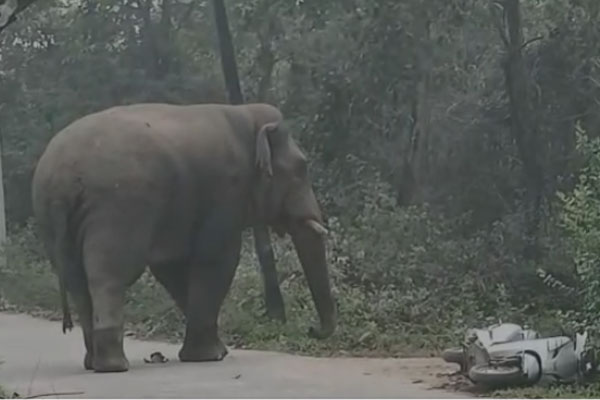 ರಸ್ತೆಯಲ್ಲಿ ನಿಂತಿದ್ದ ಒಂಟಿ ಸಲಗ ನೋಡಿ ಬೈಕ್ ಸವಾರ ಶಾಕ್