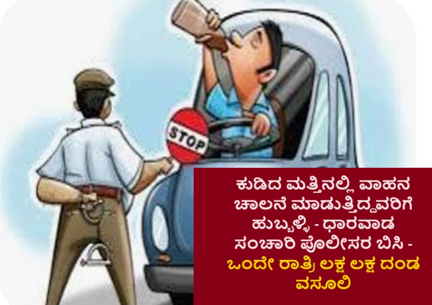 Hubli News: ಹುಬ್ಬಳ್ಳಿ: ಹುಬ್ಬಳ್ಳಿ-ಧಾರವಾಡ ಸಂಚಾರಿ ಪೊಲೀಸರು ಶುಕ್ರವಾರ ತಡರಾತ್ರಿ ಅವಳಿ ನಗರದಲ್ಲಿ ಕುಡಿದ ಮತ್ತಿನಲ್ಲಿ ವಾಹನ ಓಡಿಸುವ ಸವಾರರಿಗೆ ಬಿಸಿ ಮುಟ್ಟಿಸಿ ಲಕ್ಷ ಲಕ್ಷ ದಂಡವನ್ನು ವಸೂಲಿ ಮಾಡಿದ್ದಾರೆ. ಕುಡಿದ ಮತ್ತಿನಲ್ಲಿ ವಾಹನ ಚಾಲನೆ ಮಾಡುವುದರಿಂದ ಅಪಘಾತಗಳು ಆಗುತ್ತಿದ್ದು ಸಾಕಷ್ಟು ಸಾವು ನೋವುಗಳು ಆಗುತ್ತಿರೋ ನಿಟ್ಟಿನಲ್ಲಿ ಪೊಲೀಸರು ಕ್ರಮಕ್ಕೆ ಮುಂದಾಗಿದ್ದಾರೆ.