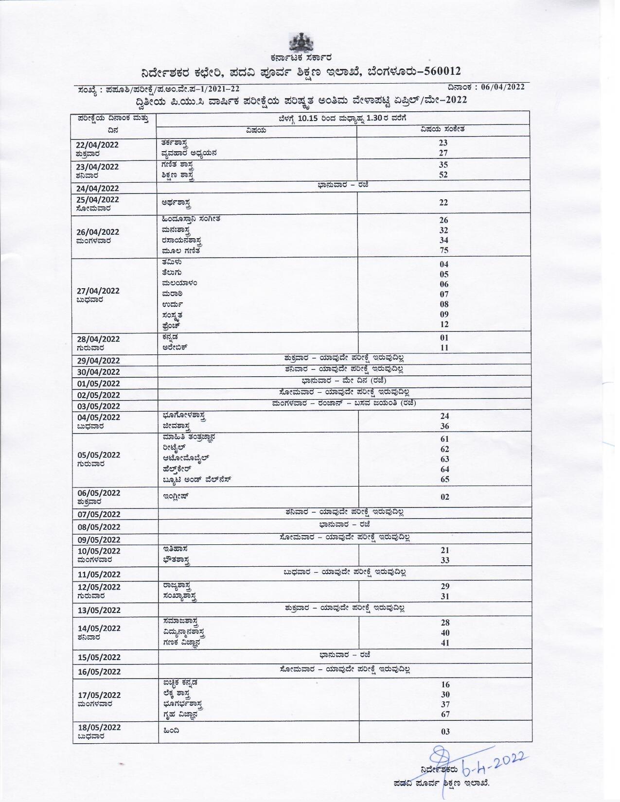 ಬೆಂಗಳೂರು: 2021-22ನೇ ಸಾಲಿನ ದ್ವಿತೀಯ ಪಿಯುಸಿ ವಾರ್ಷಿಕ ಪರೀಕ್ಷೆಯ ಅಂತಿಮ ವೇಳಾಪಟ್ಟಿಯನ್ನು ಮತ್ತೆ ಪರಿಷ್ಕೃತಗೊಳಿಸಲಾಗಿದೆ.