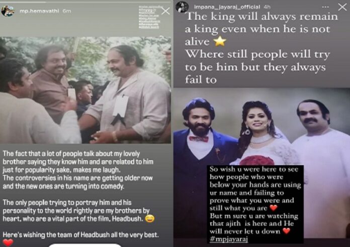 ಹೆಡ್ ಬುಷ್ ಪ್ರಚಾರಕ್ಕಾಗಿ ಜಯರಾಜ್ ಗೆಟಪ್ಪಿನಲ್ಲಿ ಡಾಲಿ ಧನಂಜಯ ಓಡಾಡ್ತಿರೋ ಈ ಸಂದರ್ಭದಲ್ಲಿ ಇಂಪನ ಅಜಿತ್ ಜಯರಾಜ್ ಪೋಸ್ಟ್ ಡಾಲಿ ಧನಂಜಯ ಅಭಿಮಾನಿಗಳನ್ನ ಕೆರಳಿಸಿದೆ. ಈ ನಡುವೆ ಅಜೀತ್ ಜಯರಾಜ್ ಮತ್ತು ಪತ್ನಿ ಇಂಪನಾಗೆ, ಜಯರಾಜ್ ಸಹೋದರಿ ಹೇಮಾವತಿ ಕೂಡ, ಹೆಡ್ ಬುಷ್ ಸಿನಿಮಾಗೆ ಆಲ್‌ ದಿನ ಬೆಸ್ಟ್ ಹೇಳುವ ಮೂಲಕ ಇಂಡೈರೆಕ್ಟ್ ಟಾಂಗ್ ಕೊಟ್ಟಿದ್ದಾರೆ.
