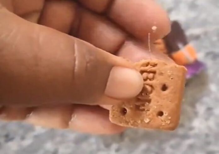 A resident of Kamareddy district in Telangana made a shocking discovery as he noticed a thin iron wire embedded in one of the Bourbon biscuits he just brought for his kids. pic.twitter.com/w0v86MiKV5