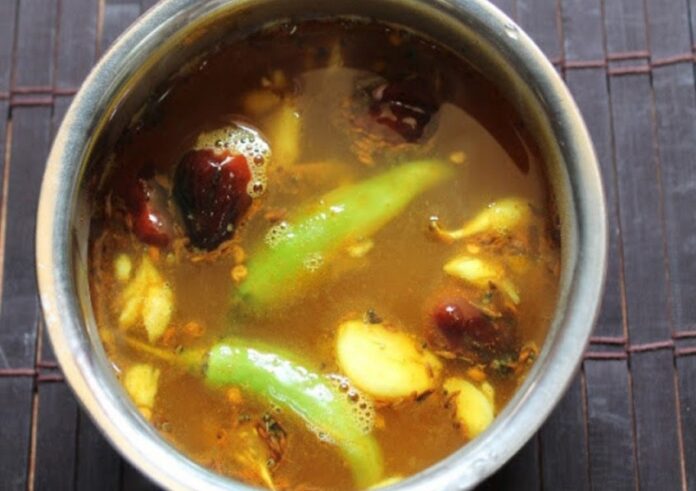 ಬೇಕಾಗುವ ಸಾಮಗ್ರಿ: ಅರ್ಧ ಕಪ್ ತೊಗರಿ ಬೇಳೆ, ಮೂರು ಹಸಿ ಮೆಣಸು, ಕೊಂಚ ಕೊತ್ತಂಬರಿ ಸೊಪ್ಪು, ಎರಡು ಟೊಮೆಟೋ, ಕೊಂಚ ಅರಿಶಿನ, ಬೆಲ್ಲ, ಒಂದು ನಿಂಬೆ ಹಣ್ಣಿನ ರಸ, ರುಚಿಗೆ ತಕ್ಕಷ್ಟು ಉಪ್ಪು, ತುಪ್ಪ. ಒಗ್ಗರಣೆಗೆ ಕರಿಬೇವು, ಸಾಸಿವೆ, ಜೀರಿಗೆ, ಒಣಮೆಣಸು, ಉದ್ದಿನ ಬೇಳೆ, ಕಡಲೆ ಬೇಳೆ.
