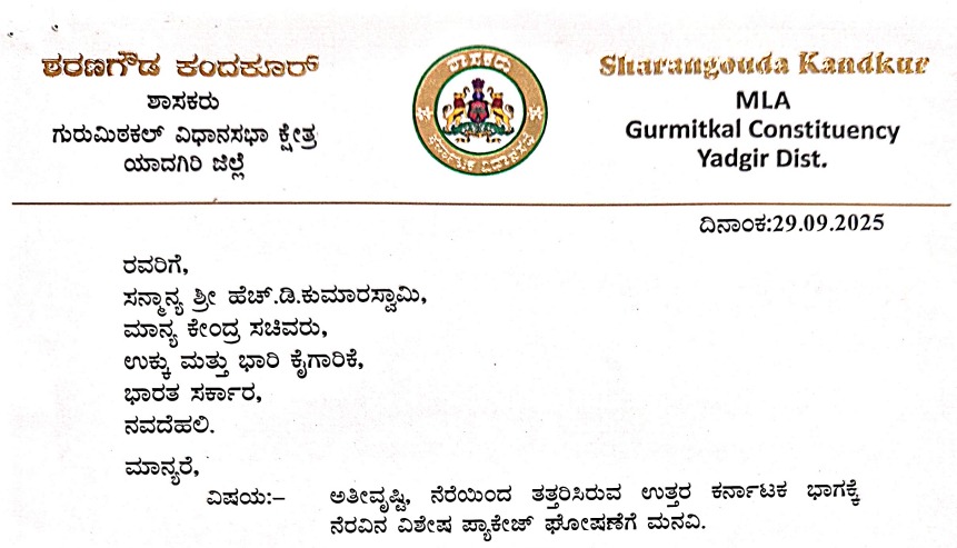 ಅತೀವೃಷ್ಟಿ ಮತ್ತು ಪ್ರವಾಹದಿಂದ ಉತ್ತರ ಕರ್ನಾಟಕ ತತ್ತರಿಸಿ ಹೋಗಿದೆ. ಹಾಗಾಗಿ ಈ ಭಾಗಕ್ಕೆ ತಕ್ಷಣ ನೆರವು ನೀಡಲು ವಿಶೇಷ ಪ್ಯಾಕೇಜ್ ಘೋಷಿಸುವಂತೆ ಯಾದಗಿರಿ ಜಿಲ್ಲಾ ಶಾಸಕ ಶರಣಗೌಡ ಕಂದಕೂರ್ ಆಗ್ರಹಿಸಿದ್ದಾರೆ. ಕೇಂದ್ರ ಸಚಿವ ಹೆಚ್.ಡಿ. ಕುಮಾರಸ್ವಾಮಿ ಅವರಿಗೆ ಯಾದಗಿರಿ ಜಿಲ್ಲಾ ಶಾಸಕ ಶರಣಗೌಡ ಕಂದಕೂರ್ ಮನವಿ ಪತ್ರವನ್ನ ಸಲ್ಲಿಸಿದ್ದಾರೆ.