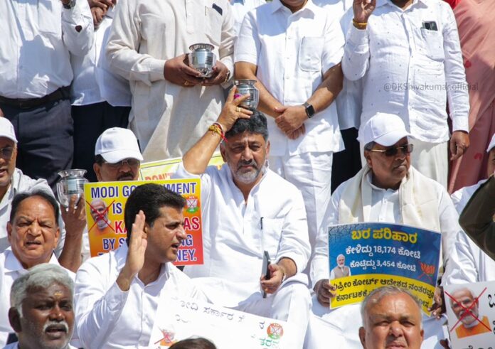 Political News: ಕರ್ನಾಟಕಕ್ಕೆ ಬರಬೇಕಾದ ಬರಪರಿಹಾರದಲ್ಲೇ, ಕೆಲವೇ ಕೆಲವರಷ್ಟು ಮೊತ್ತದ ಹಣವನ್ನು ಕೇಂದ್ರ ಸರ್ಕಾರ ಬಿಡುಗಡೆ ಮಾಡಿದೆ ಎಂದು ಕಾಂಗ್ರೆಸ್ ಸರ್ಕಾರ ಇಂದು ಪ್ರತಿಭಟನೆ ಹಮ್ಮಿಕೊಂಡಿತ್ತು. ಬೆಂಗಳೂರಿನ ವಿಧಾನಸೌಧದ ಎದುರು ಇರುವ ಗಾಂಧಿ ಪ್ರತಿಮೆ ಎದುರು ಕಾಂಗ್ರೆಸ್ ನಾಯಕರು ಪ್ರತಿಭಟನೆ ನಡೆಸಿದ್ದು, ಸಿಎಂ, ಡಿಸಿಎಂ ಸೇರಿ ಹಲವು ಕಾಂಗ್ರೆಸ್ ನಾಯಕರು ಭಾಗಿಯಾಗಿದ್ದರು.