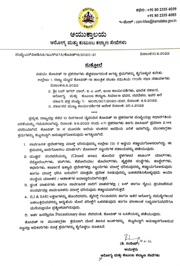 ಈ ಕುರಿತಂ ರಾಜ್ಯ ಆರೋಗ್ಯ ಮತ್ತು ಕುಟುಂಬ ಕಲ್ಯಾಣ ಇಲಾಖೆ ಸುತ್ತೋಲೆ ಹೊರಡಿಸಿದ್ದು, ಮುಚ್ಚಿದ ಸ್ಥಳಗಳಲ್ಲಿ, ಸಾರ್ವಜನಿಕ ಸ್ಥಳಗಳಲ್ಲಿ ಮಾಸ್ಕ್ ಧರಿಸೋದು ಕಡ್ಡಾಯ. ಈ ಪಬ್, ಬಾರ್, ರೆಸ್ಟೋರೆಂಟ್, ಕಚೇರಿ, ಕಾರ್ಖಾನೆಗಳಲ್ಲಿ ಜನರು ಮಾಸ್ಕ್ ಧರಿಸೋದು ಕಡ್ಡಾಯ. ಮಾಸ್ಕ್ ಧರಿಸಿದ್ದರೆ ಮಾತ್ರವೇ ಒಳ ಪ್ರವೇಶಿಸಲು ಅವಕಾಶ ನೀಡುವಂತೆ ಸೂಚಿಸಿದೆ.