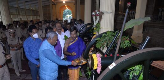ಮೈಸೂರು ದಸರಾ: ಫಿರಂಗಿ ಗಾಡಿಗಳಿಗೆ ಸಚಿವ ಎಸ್.ಟಿ.ಸೋಮಶೇಖರ್ ಪೂಜೆ