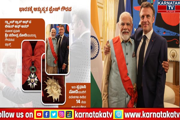 ಫ್ರಾನ್ಸ್ ದೇಶ ನೀಡುವ ಅತ್ಯುನ್ನತ ಗೌರವವಾದ ಲೀಜನ್ ಆಫ್ ಹಾನರ್ನಿಂದ ಪ್ರಧಾನಿ ನರೇಂದ್ರ ಮೋದಿ ಅವರನ್ನು ಗೌರವಿಸಲಾಗಿದೆ. ಲೀಜನ್ ಆಫ್ ಹಾನರ್ ಹೆಸರಲ್ಲಿ ಫ್ರಾನ್ಸ್ ದೇಶ ನೀಡುವ ಉನ್ನತ ಮಟ್ಟದ ಗೌರವಗಳು ಐದು ಶ್ರೇಣಿಯಲ್ಲಿದ್ದು ಆ ಪೈಕಿ ಪ್ರಧಾನಿ ನರೇಂದ್ರ ಮೋದಿಯವರಿಗೆ ನೀಡಲಾದ ಗ್ರ್ಯಾಂಡ್ ಕ್ರಾಸ್ ಆಫ್ ದ ಲೀಜನ್ ಅತ್ಯುನ್ನತ.