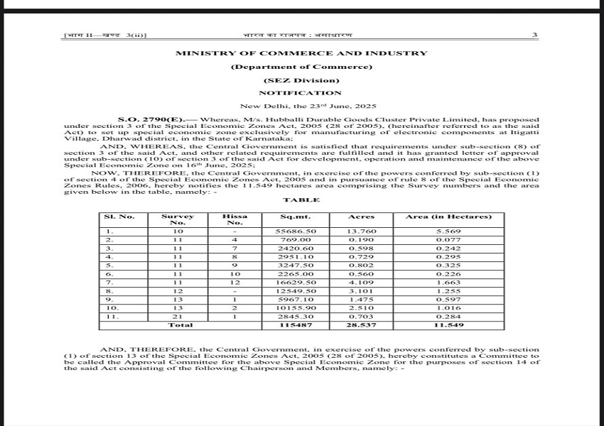 ಧಾರವಾಡದ ಇಟ್ಟಿಗಟ್ಟಿಯಲ್ಲಿ ʼಏಕಸ್ ಇನ್ಫ್ರಾದ ಹುಬ್ಬಳ್ಳಿ ಡ್ಯೂರಬಲ್ ಗೂಡ್ಸ್ ಕ್ಲಸ್ಟರ್ ಪ್ರೈವೇಟ್ ಲಿಮಿಟೆಡ್ ಪ್ರಸ್ತಾಪಿಸಿತ ಎಲೆಕ್ಟ್ರಾನಿಕ್ ಘಟಕಗಳಿಗಾಗಿ ವಿಶೇಷ ಆರ್ಥಿಕ ವಲಯ (SEZ) ವನ್ನು ಕೇಂದ್ರ ಸರ್ಕಾರ ಅಧಿಕೃತವಾಗಿ ಗೆಜೆಟ್ನಲ್ಲಿ ಪ್ರಕಟಿಸಿದೆ.