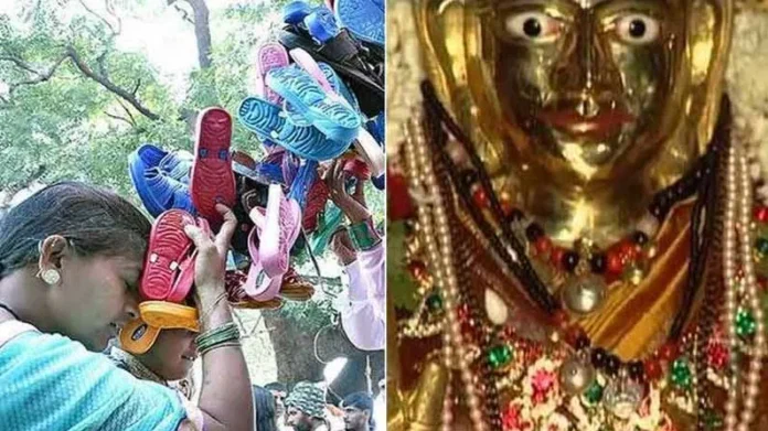 ಹಿಂದೊಮ್ಮೆ ಈ ಪ್ರದೇಶದಲ್ಲಿ ಎತ್ತು ಬಲಿ ನೀಡುವ ಪದ್ಧತಿ ಇತ್ತು. ಆದರೆ ಸರ್ಕಾರ ಈ ಆಚರಣೆಯನ್ನು ನಿಷೇಧಿಸಿದ ನಂತರ, ಭಕ್ತರು ದೇವಿಯನ್ನು ಸಮಾಧಾನಪಡಿಸುವ ನೂತನ ವಿಧಾನವಾಗಿ ಚಪ್ಪಲಿ ಅರ್ಪಿಸುವ ಸಂಪ್ರದಾಯ ಆರಂಭಿಸಿದರು. ದಂತಕಥೆಯ ಪ್ರಕಾರ ಒಬ್ಬ ಋಷಿ ತನ್ನ ಬಲಿಯ ಬದಲಿಗೆ ಚಪ್ಪಲಿಯನ್ನು ಅರ್ಪಿಸಿದಾಗ ದೇವಿ ಪ್ರಸನ್ನಳಾದಳು ಅಂತ ಹೇಳಲಾಗಿದೆ…