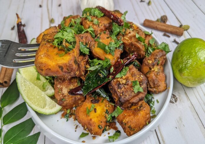 ಬೇಕಾಗುವ ಸಾಮಗ್ರಿ: ಒಂದು ಬೌಲ್ ಪನೀರ್, 1 ಸಣ್ಣಗೆ ಹೆಚ್ಚಿದ ಈರುಳ್ಳಿ, 1 ಕ್ಯಾಪ್ಸಿಕಂ, ಒಂದು ಚಿಕ್ಕ ಕಪ್ ಮೈದಾ, ಅರ್ಧ ಕಪ್ ಕಾರ್ನ್ ಫ್ಲೋರ್, ಒಂದುವರೆ ಸ್ಪೂನ್ ಪೆಪ್ಪರ್, ಒಂದು ಸ್ಪೂನ್ ಸೋಂಪು, ಒಂದು ಸ್ಪೂನ್ ಜೀರಿಗೆ, 1 ಒಣ ಮೆಣಸು, ಒಂದು ಚಕ್ಕೆ, 3 ಲವಂಗ, ಚಿಟಿಕೆ ಅರಿಶಿನ, ಒಂದು ಸ್ಪೂನ್ ಖಾರದ ಪುಡಿ, ಕಾಲು ಕೊಂಚ ಸಣ್ಣಗೆ ಹೆಚ್ಚಿದ ಕೊತ್ತೊಂಬರಿ ಸೊಪ್ಪು, ಸ್ಪೂನ್ ಪೆಪ್ಪರ್ ಪುಡಿ, ಎರಡು ಸ್ಪೂನ್ ಟೊಮೆಟೋ ಸಾಸ್, 10 ಎಸಳು ಬೆಳ್ಳುಳ್ಳಿ, 10 ಎಸಳು ಕರಿಬೇವು, ಕರಿಯಲು ಎಣ್ಣೆ, ರುಚಿಗೆ ತಕ್ಕಷ್ಟು ಉಪ್ಪು.