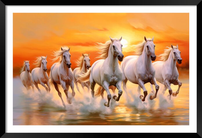 ಏಳು ಕುದುರೆಗಳು ಸೂರ್ಯನ ರಥವನ್ನು ಎಳೆಯುವ ಸಂಕೇತವಾಗಿವೆ. ಅವು ಶ್ರಮ, ವೇಗ ಮತ್ತು ಯಶಸ್ಸಿನ ಪ್ರತೀಕ. ಈ ಚಿತ್ರವನ್ನು ದಿನನಿತ್ಯ ನೋಡುವುದರಿಂದ ಮನಸ್ಸಿಗೆ ಚೈತನ್ಯ, ಶಕ್ತಿ ಮತ್ತು ಪ್ರೇರಣೆ ದೊರೆಯುತ್ತದೆ. ಮನೆಯಲ್ಲಿ ಕಲಹ, ಅಶಾಂತಿ, ಆಸಕ್ತಿಯ ಕೊರತೆ ಇತ್ಯಾದಿ ಸಮಸ್ಯೆಗಳು ದೂರವಾಗುತ್ತವೆ.
