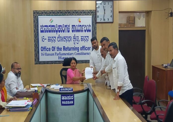 Hassan News: ಹಾಸನ : ಇಂದು ಮೈತ್ರಿ ಅಭ್ಯರ್ಥಿ ಪ್ರಜ್ವಲ್ ರೇವಣ್ಣ ನಾಮಪತ್ರ ಸಲ್ಲಿಸಿದ್ದು, ಜಿಲ್ಲಾಧಿಕಾರಿ ಕಚೇರಿಗೆ ಆಗಮಿಸಿ, ಸೂಚಕರಾಗಿ ಮಾಜಿ ಪ್ರಧಾನಿ ಹೆಚ್.ಡಿ.ದೇವಗೌಡರು ಸಹಿ ಹಾಕಿದ್ದಾರೆ.