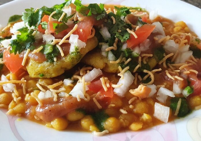 ಗಾರ್ನಿಶ್ ಮಾಡಲು: ಹುಳಿ ಚಟ್ನಿ, ಗ್ರೀನ್ ಚಟ್ನಿ, ಒಂದು ಸಣ್ಣಗೆ ಹೆಚ್ಚಿದ ಈರುಳ್ಳಿ ಮತ್ತು ಟೊಮೆಟೋ, ಒಂದು ಕಪ್ ಸೇವ್, ಖಾರಾ ಬೂಂದಿ ಮತ್ತು ಖಾರಾ ಕಾರ್ನ್ ಫ್ಲೇಕ್ಸ್ ಮಿಕ್ಸ್.