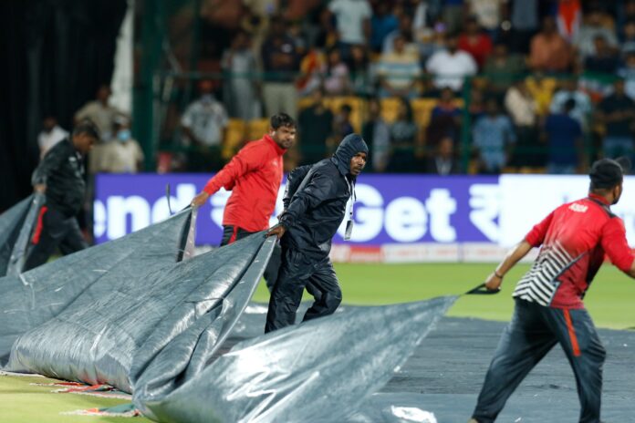 ಪಂದ್ಯ ಆರಂಭಕ್ಕೂ ಮುನ್ನವೇ ಕಾರ್ಮೋಡ ಆವರಿಸಿತ್ತು. ಸಂಜೆ 7 ಗಂಟೆ ಸಮಯದಲ್ಲಿ ತುಂತುರು ಮಳೆ ಸುರಿಯಿತು.7.15ರ ವೇಳೆಗೆ ಮಳೆ ನಿಂತು ಹೋಗಿದ್ದರಿಂದ ಪಂದ್ಯ ಪಂದ್ಯ ಆರಂಭಕ್ಕೆ ಸಿದ್ಧತೆ ನಡೆದವು.