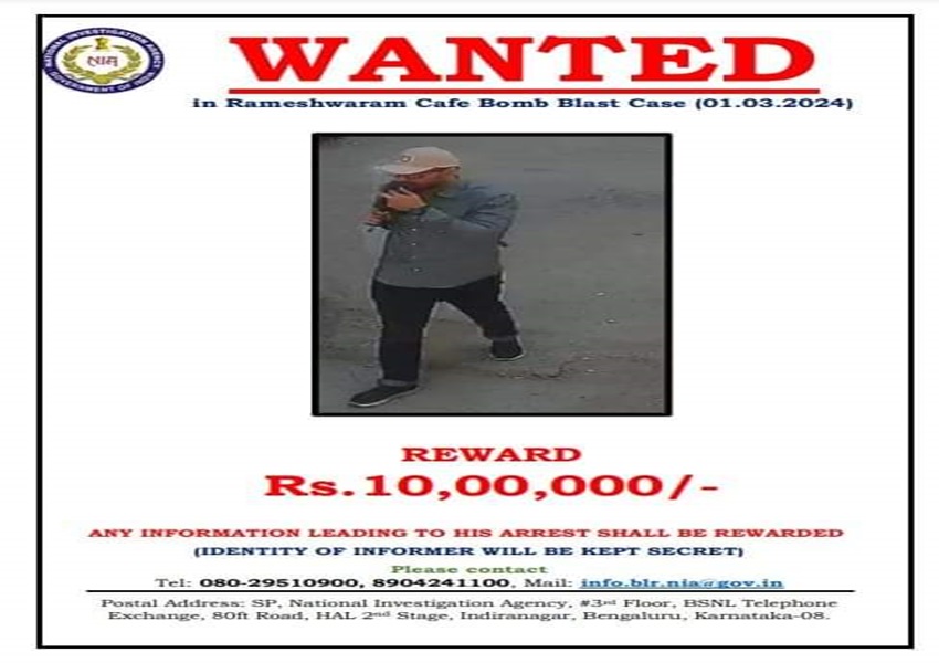ರಾಮೇಶ್ವರಂ ಕೆಫೆ ಬಾಂಬ್ ಬ್ಲಾಸ್ಟ್ ಕೇಸ್: ಬಾಂಬರ್ ಮಾಹಿತಿ ಕೊಟ್ಟವರಿಗೆ 10 ಲಕ್ಷ ಬಹುಮಾನ