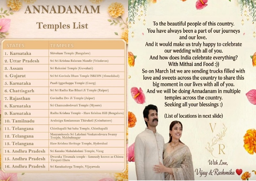 ಇದೀಗ ತಮ್ಮ ಮದುವೆ ವಿಶೇಷವಾಗಿ ರಶ್ಮಿಕಾ ಮತ್ತು ವಿಜಯ್ ದೇಶಾದ್ಯಂತ ಅನ್ನದಾಸೋಹಕ್ಕೆ ಮುಂದಾಗಿದೆ. ದೇಶದ ಎಲ್ಲಾ ರಾಜ್ಯಗಳ ಪ್ರಸಿದ್ಧ ದೇವಸ್ಥಾನಗಳಲ್ಲಿ ಅನ್ನದಾನ ಮಾಡಲು ಮುಂದಾಗಿದ್ದಾರೆ ವಿರೋಶ್. ಮಾರ್ಚ್ 1ರಿಂದಲೇ ಅವರು ಸೂಚಿಸಿರುವ ದೇವಸ್ಥಾನಗಳಲ್ಲಿ ವಿಶೇಷ ಅನ್ನ ಸಂತರ್ಪಣೆ ನಡೆಯಲಿದೆ. ಮತ್ತು ಮಾರ್ಚ್ 4ರಂದು ಹೈದರಾಬಾದ್ನಲ್ಲಿ ಆರತಕ್ಷತೆ ನಡೆಯಲಿದೆ. ಈ ಕಾರ್ಯಕ್ರಮಕ್ಕೆ ಹಲವು ಸೆಲೆಬ್ರಿಟಿಸ್ ಬರುವ ಸಾಧ್ಯತೆ ಇದೆ.