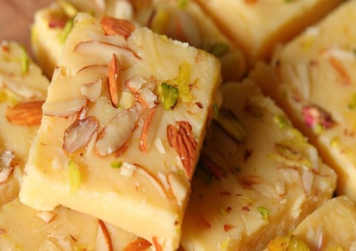 ಮಾಡುವ ವಿಧಾನ: ಮೊದಲು ಪ್ಯಾನ್ ಬಿಸಿ ಮಾಡಿ ಹಾಲು ಹಾಕಿ ಅದು ಕೊಂಚ ಬಿಸಿಯಾದ ಬಳಿಕ, ಹಾಲಿನ ಪುಡಿ, ಸಕ್ಕರೆ, ತುಪ್ಪ ಹಾಕಿ ಕೈ ಬಿಡದೇ ಚೆನ್ನಾಗಿ ಮಿಕ್ಸ್ ಮಾಡಿ. ಅದು ಬರ್ಫಿ ಹದಕ್ಕೆ ಬಂದ ಬಳಿಕ ಗ್ಯಾಸ್ ಆಫ್ ಮಾಡಿ.
