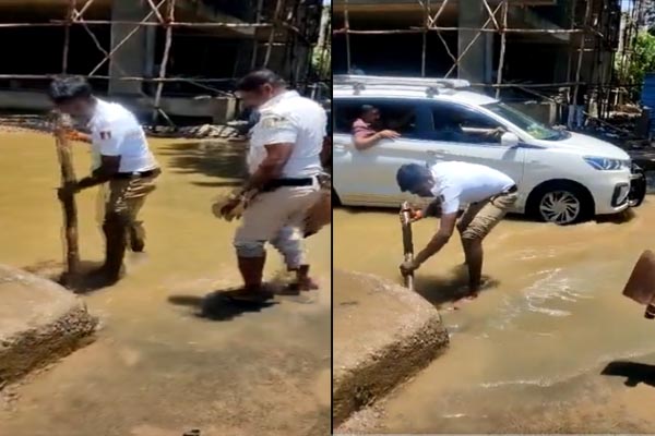ರಸ್ತೆಯಲ್ಲಿ ನಿಂತ ನೀರನ್ನು ಬಿಡಿಸುವಲ್ಲಿ ಬ್ಯುಸಿ ಟ್ರಾ,ಫಿಕ್ ಪೊಲೀಸರು…!
