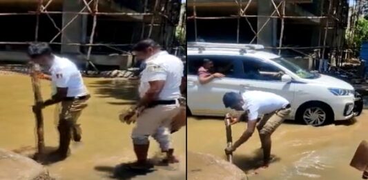 ರಸ್ತೆಯಲ್ಲಿ ನಿಂತ ನೀರನ್ನು ಬಿಡಿಸುವಲ್ಲಿ ಬ್ಯುಸಿ ಟ್ರಾ,ಫಿಕ್ ಪೊಲೀಸರು…!