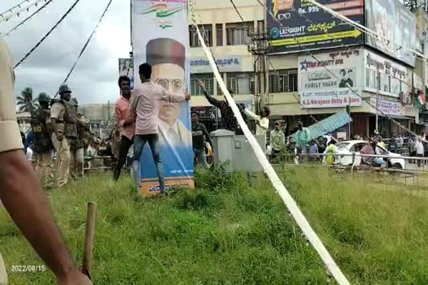 ಬಿ.ಡಿ ಸಾವರ್ಕರ್ ರವರ ಭಾವ ಚಿತ್ರದ ವಿಚಾರವಾಗಿ ಶಿವಮೊಗ್ಗದ ಅಮೀರ್ ಅಹಮದ್ ವೃತ್ತದಲ್ಲಿ 2 ಕೋಮುಗಳ ನಡುವೆ ಕಿತ್ತಾಟ ನಡೆದಿದೆ. ಹೀಗೆ ಶಿವಮೊಗ್ಗದಲ್ಲಿ ಉದ್ವಿಗ್ನ ಪರಿಸ್ಥಿತಿ ನಿರ್ಮಾಣವಾಗಿದೆ. ಮತ್ತೊಂದೆಡೆ ಒಂದು ಗುಂಪು ಟಿಪ್ಪು ಫೋಟೋ ಹಿಡಿದು ಪ್ರತಿಭಟನೆ ಮಾಡುತ್ತಿದ್ದಾರೆ. ಹಾಗೆಯೇ ಪರಿಸ್ಥಿತಿ ನಿವಾರಣೆಗಾಗಿ ಪೊಲೀಸರು ಲಾಠಿ ಚಾರ್ಜ್ ಮಾಡಿದ್ದಾರೆ.