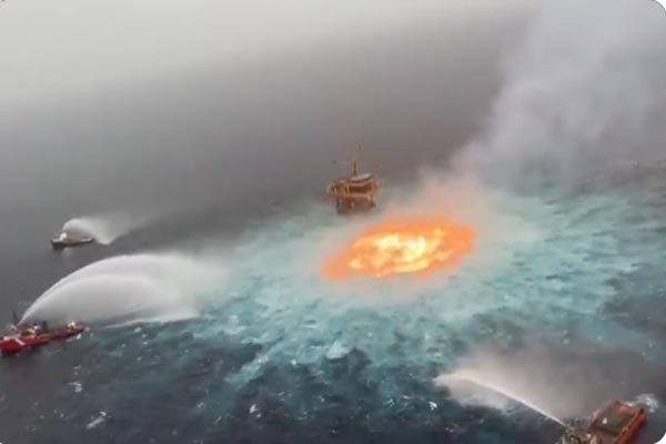 ಸಣ್ಣ ಕ್ಲಿಪ್ ಮೆಕ್ಸಿಕೊ ಕೊಲ್ಲಿಯ ಮೇಲ್ಮೈಯಲ್ಲಿ ಬೆಂಕಿಯನ್ನು ತೋರಿಸುತ್ತದೆ, ಅದು ನೀರೊಳಗಿನ ಪೈಪ್ಲೈನ್ನಿಂದ ಅನಿಲ ಸೋರಿಕೆಯ ನಂತರ ಸ್ಫೋಟಗೊಂಡಿದೆ ಎಂದು ಹೇಳಲಾಗಿದೆ.ಕಡಲಾಚೆಯ ಪ್ಲಾಟ್ಫರ್ಮ್ ಸಂಕರ್ಣಕ್ಕೆ ಜೋಡಿಸಲಾದ ನೀರೊಳಗಿನ ತೈಲ ಪೈಪ್ಲೈನ್ ಒಡೆದುಹೋದಾಗ ಈ ಘಟನೆ ಸಂಭವಿಸಿದೆ. ಮೆಕ್ಸಿಕೋದ ರ್ಕಾರಿ ಸ್ವಾಮ್ಯದ ಪೆಮೆಕ್ಸ್ ಪೆಟ್ರೋಲ್ ಕಂಪನಿ ಪೆಮೆಕ್ಸ್ ಬೆಂಕಿಯನ್ನು ಸಂಪರ್ಣವಾಗಿ ನಿಯಂತ್ರಿಸಲು ಐದು ಗಂಟೆಗಳಿಗೂ ಹೆಚ್ಚು ಸಮಯ ತೆಗೆದುಕೊಂಡಿದೆ ಎಂದು ಹೇಳಲಾಗಿದೆ. ಒಟ್ಟಾರೆ ವಿನಾಶವಾಗುತ್ತಿದೆ ಎಂಬ ಸುಳ್ಳು ಸುದ್ದಿಗೆ ಇದೀಗ ತೆರೆ ಬಿದ್ದಿದೆ.