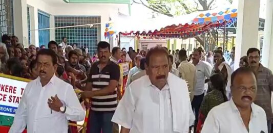Hassan News: ಹಾಸನ : ಮಹಾಶಿವರಾತ್ರಿ ಹಬ್ಬದ ದಿನವೂ, ಹಾಸನದಲ್ಲಿ ರೈತರು ಕೊಬ್ಬರಿ ಖರೀದಿ ನೋಂದಣಿಗೆ ಮುಗಿಬಿದ್ದಿದ್ದಾರೆ. ಬೆಳಿಗ್ಗೆಯಿಂದಲೂ ಅರಸೀಕೆರೆ ನೋಂದಣಿ ಕೇಂದ್ರಗಳ ಮುಂದೆ, ರೈತರು ಮತ್ತು ಮಹಿಳೆಯರು ಗಂಟೆಗಟ್ಟಲೆ ಕ್ಯೂ ನಿಂತಿದ್ದಾರೆ. ಈ ವಿಷಯ ತಿಳಿದ ಸ್ಥಳೀಯ ಶಾಸಕ ಕೆ.ಎಂ.ಶಿವಲಿಂಗೇಗೌಡ, ಸ್ಥಳಕ್ಕೆ ಧಾವಿಸಿ, ಲಾಠಿ ಹಿಡಿದು ರೈತರನ್ನು ನಿಯಂತ್ರಿಸಿದ್ದಾರೆ. ಅಲ್ಲದೇ ಶಿವಲಿಂಗೇಗೌಡ ಕೂಡ ಬೆಳಿಗ್ಗೆಯಿಂದ ಎಪಿಎಂಸಿಯಲ್ಲಿರುವ ನೋಂದಣಿ ಕೇಂದ್ರದ ಬಳಿಯೇ ಕುಳಿತಿದ್ದರು. ಸರತಿ ಸಾಲಿನಲ್ಲಿ ನಿಂತಿರುವ ರೈತರಿಗೆ ಕುಡಿಯುವ ನೀರು, ಮಧ್ಯಾಹ್ನದ ಊಟದ ವ್ಯವಸ್ಥೆ ಮಾಡಿದ್ದಾರೆ. … Continue reading ನೋಂದಣಿ ಕೇಂದ್ರದಲ್ಲಿ ರೈತರನ್ನು ನಿಯಂತ್ರಿಸಿ, ನೀರು, ಊಟದ ವ್ಯವಸ್ಥೆ ಮಾಡಿದ ಶಾಸಕ ಶಿವಲಿಂಗೇಗೌಡ