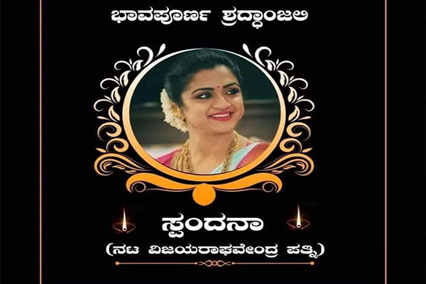 ಸಿನಿಮಾ ಸುದ್ದಿ: ನಿನ್ನೆ ಹೃದಯಾಘಾತದಿಂದ ಮೃತಪಟ್ಟಿರುವ  ನಟ ವಿಜಯ್ ರಾಘವೇಂದ್ರ ಅವರ ಪತ್ನಿ ಸ್ಪಂದನಾ ಅವರ ಪಾರ್ಥೀವ ಶರೀರ ಇಂದು ರಾತ್ರಿ 11 ಗಂಟೆ ಸುಮಾರಿಗೆ ಬೆಂಗಳೂರಿನ ವಿಮಾನ ನಿಲ್ದಾಣಕ್ಕೆ ಬರಲಿದ್ದು ನಂತರ ಮಲ್ಲೇಶ್ವರಂನ ಮನೆಗೆ ತರಲಾಗುವುದು.