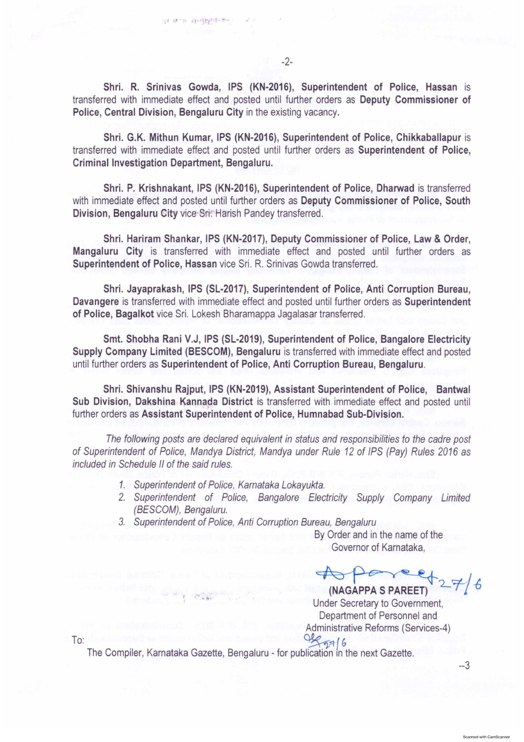 ಇನ್ನುಳಿದ ಐಪಿಎಸ್ ಅಧಿಕಾರಿಗಳ ವರ್ಗಾವಣೆ ಪಟ್ಟಿ, ಈ ಕೆಳಗಿನಂತಿದೆ