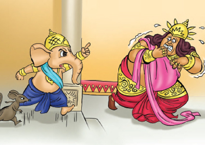ಆಗ ಗಣೇಶ, ನನ್ನ ಹಸಿವಿನ್ನೂ ನೀಗಿಲ್ಲ. ನಾನೀಗ ನಿಮ್ಮನ್ನೇ ತಿನ್ನುತ್ತೇನೆಂದು ಹೇಳಿ, ಕುಬೇರನನ್ನು ಅಟ್ಟಿಸಿಕೊಂಡು ಬರುತ್ತಾನೆ. ಆಗ ಕುಬೇರನಿಗೆ ತನ್ನ ತಪ್ಪಿನ ಅರಿವಾಗಿ, ಗಣೇಶನಲ್ಲಿ ಕ್ಷಮೆ ಕೇಳುತ್ತಾನೆ. ಹೀಗೆ ಗಣೇಶ ಕುಬೇರನ ಅಹಂಕಾರ ಇಳಿಸುತ್ತಾನೆ. ಹೀಗೆ ಕಾಲ ಕಳೆದಂತೆ, ಕುಬೇರನಿಂದ ಸ್ವರ್ಣ ಲಂಕೆ ರಾವಣನ ಪಾಲಾಗುತ್ತದೆ.