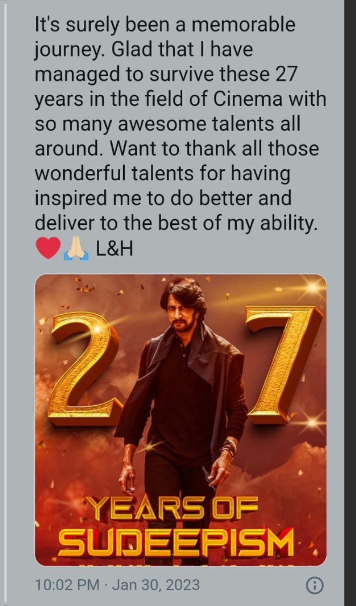 ಸಿನಿಮಾ ಕ್ಷೇತ್ರದಲ್ಲಿ ಈ 27 ವರ್ಷಗಳಲ್ಲಿ ನಾನು ಅನೇಕ ಅದ್ಭುತ ಪ್ರತಿಭೆಗಳೊಂದಿಗೆ ಉಳಿದುಕೊಳ್ಳುವಲ್ಲಿ ಯಶಸ್ವಿಯಾಗಿದ್ದೇನೆ. ಉತ್ತಮವಾಗಿ ಕಾರ್ಯನಿರ್ವಹಿಸಲು ಮತ್ತು ನನ್ನ ಸಾಮರ್ಥ್ಯಕ್ಕೆ ತಕ್ಕಂತೆ ತಲುಪಿಸಲು ನನಗೆ ಸ್ಫೂರ್ತಿ ನೀಡಿದ್ದಕ್ಕಾಗಿ ಆ ಎಲ್ಲ ಅದ್ಭುತ ಪ್ರತಿಭೆಗಳಿಗೆ ಧನ್ಯವಾದ ಹೇಳಲು ಬಯಸುತ್ತೇನೆ ಎಂದು ಕಿಚ್ಚ ಸುದೀಪ್ ಬರೆದುಕೊಂಡಿದ್ದಾರೆ.