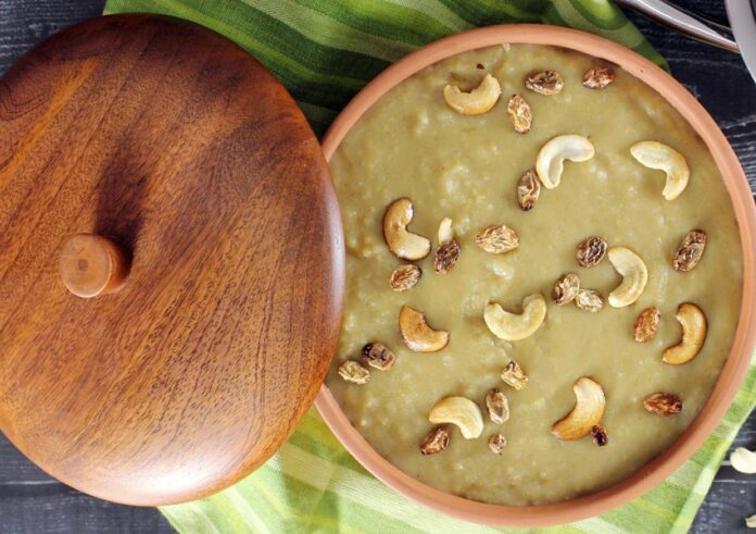ಬೇಕಾಗುವ ಸಾಮಗ್ರಿ: ಒಂದು ಕಪ್ ಅಕ್ಕಿ, ಅರ್ಧ ಕಪ್ ಹೆಸರು ಬೇಳೆ, ಎರಡು ಕಪ್ ಬೆಲ್ಲ, ಅರ್ಧ ಕಪ್ ತುಪ್ಪ, ಅರ್ಧ ಕಪ್ ಹಾಲು, ನಾಲ್ಕು ಏಲಕ್ಕಿ, 2 ಲವಂಗ, ಕಾಲು ಕಪ್ ಗೋಡಂಬಿ ಮತ್ತು ದ್ರಾಕ್ಷಿ.